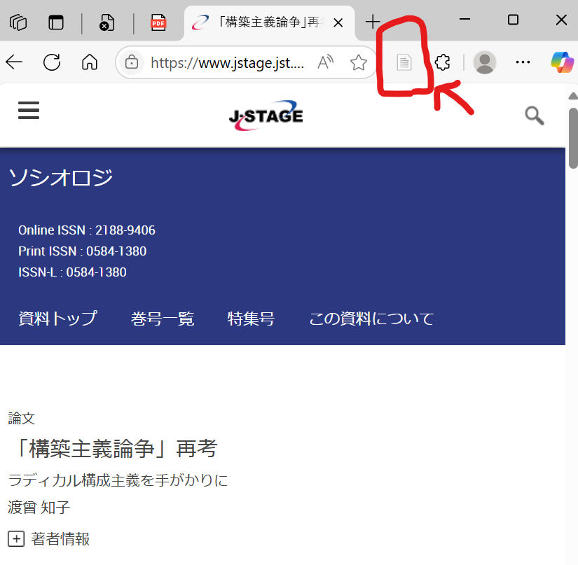 あらかじめZotero上で「マイ・ライブラリ」の中に適当なフォルダを作っておく。J-Stage等で任意の論文のページを開き、Zotero Connectorのボタンをクリック(ボタンはピン留めしておくとよい)。