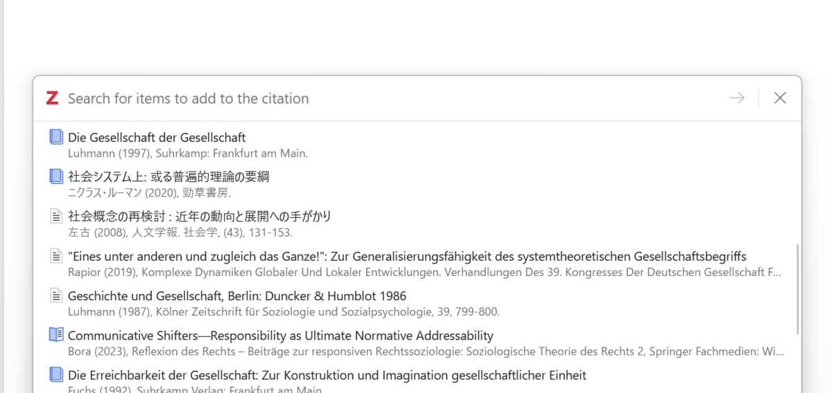 検索欄に自分が引用したい文献の著者名または文献名(刊行年や掲載雑誌名等でもOK)を入力すると、Zoteroに保存されている文献情報が選択できるはずだ。