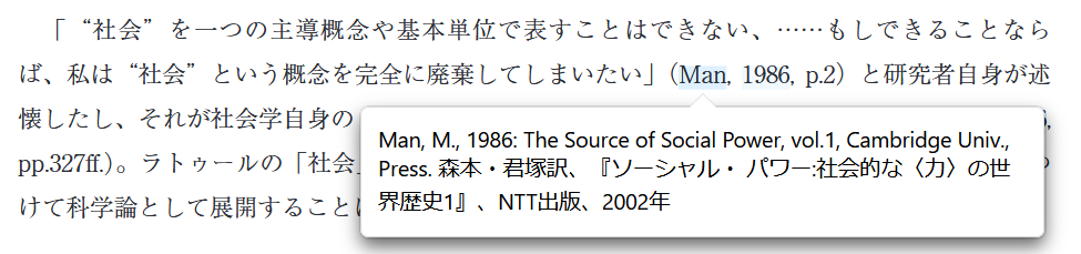 本文中の文献注にカーソルを重ねると文献の書誌情報が表示される :Zotero 7から新しく装備された機能。以下の画像のように、本文中に出てくる引用の割注(Man, 1986)にマウスカーソルを置くと、論文末尾に記載されている文献リストの該当箇所が表示される。本文中の引用がどのような文献からのものなのか確認したいときに、いちいち末尾の文献リストまでスクロールする必要がなくなって便利である。文末脚注についても同様の機能がある。ただしまだ精度は低い。