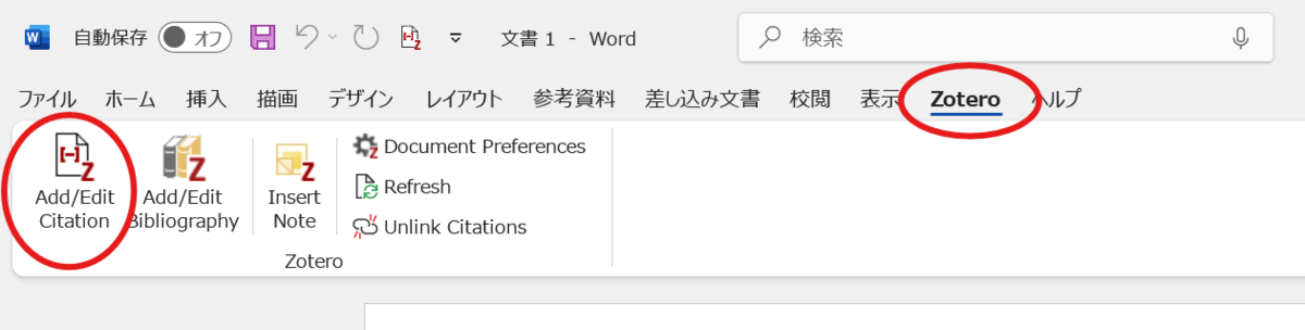 次に、Zoteroタブから「Add/Edit Bibliography」クリック。
