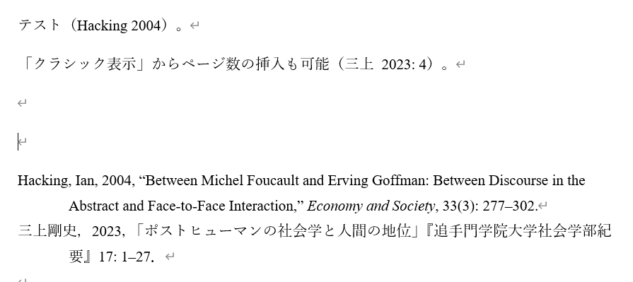 問題なくプラグインが機能してくれれば、本文中の引用に対応した文献リストが自動作成されるはずだ。