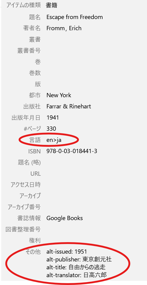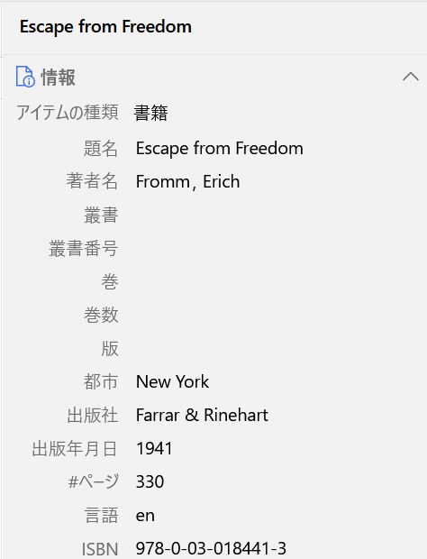 Google Books等で検索し、Escape from Freedom の原書の書誌情報をブラウザ拡張機能(前述)を使って取り込む。この本のように、複数のバージョンが存在する書籍を扱うときは、取り込むデータが自分の参照している本のそれと一致しているか注意すること。