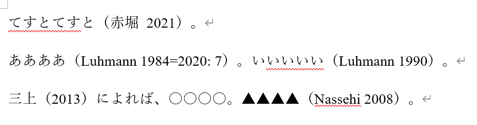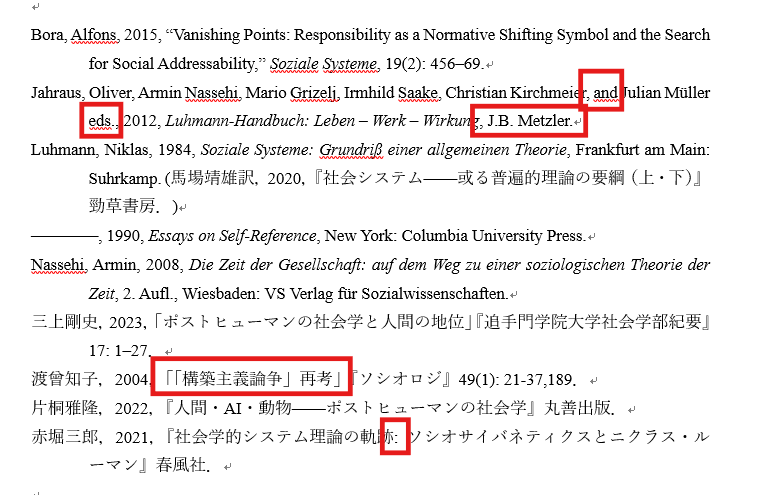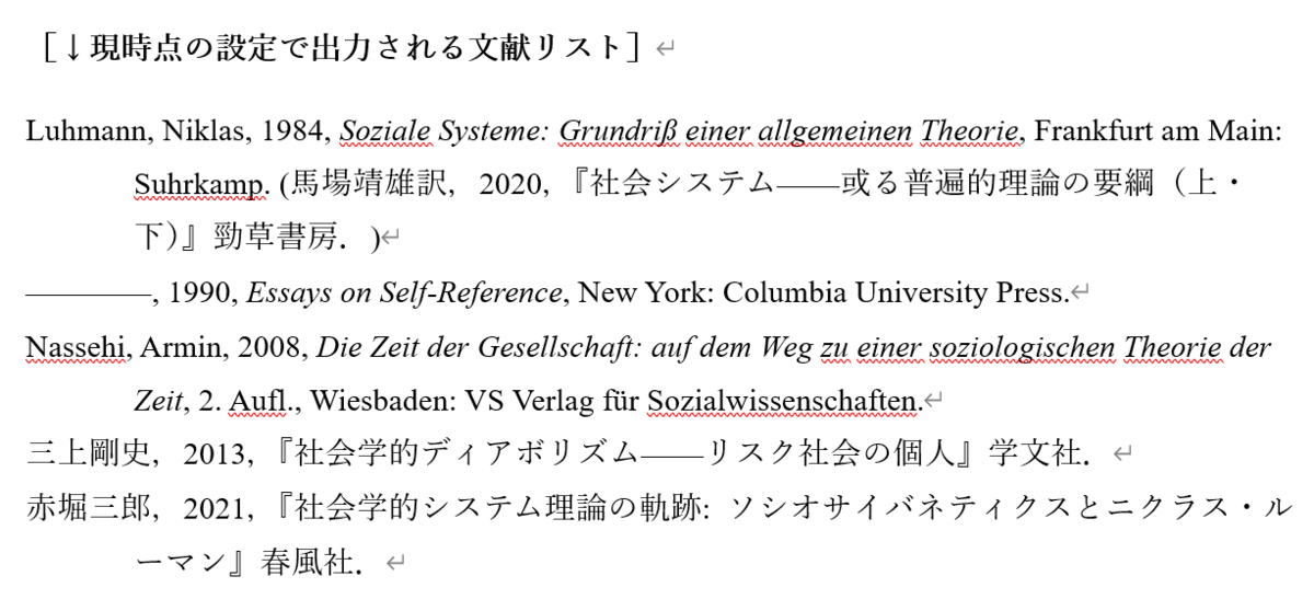 欧文文献→邦文文献の順番でリスト化される。 本来ここは、赤堀(2021)→Luhmann(1984)→Luhmann(1990)→三上(2013)→Nassehi(2008)の順に並んでないといけない。