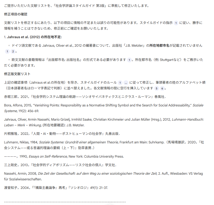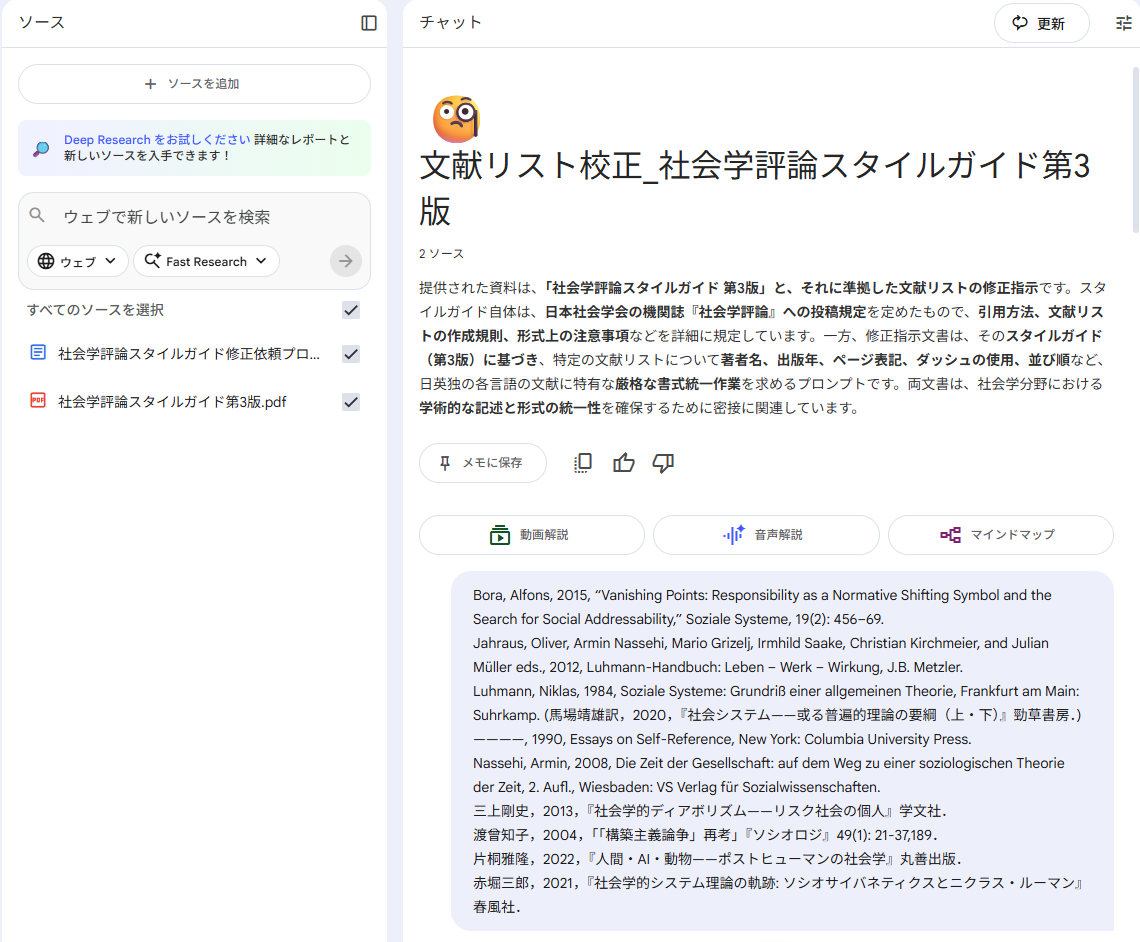 Notebook LMでは、ユーザー自身がソースを指定することができるので、AIが勝手にネットから信頼できない情報を拾ってくることを避けられる。以下で行うように、「社会学評論スタイルガイド」のPDFと自身の使用言語に即したプロンプトを読み込ませておけば、非常に高い精度でリストの校正を行ってくれる。