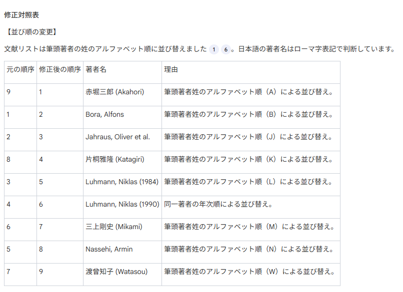文献リストと同時に修正対照表も出力されているので確認する。 まず並び順だが、文献リストを見た限りでは正しくソート処理がされていたが、よく見てみると「渡會(Watarai)」の読み方が「Watoso」と認識されている。結果的に正しい位置に収まっているが、人間と同様AIも読み間違いをするので、きちんと自分の目で確認する必要がある。