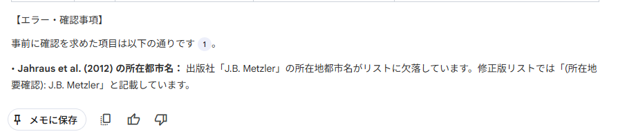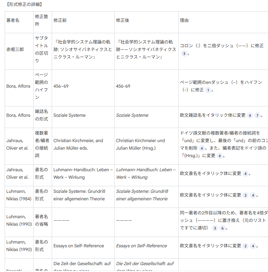 またドイツ語文献のandがund、eds.が(Hrsg.)に正しく変換されていたりと、細かい書式上の問題が修正されている。副題のコロン→2倍ダッシュや、一重カギカッコ内のカッコの扱い、出版社所在地の抜けなどがきちんと指摘されていることがわかる。